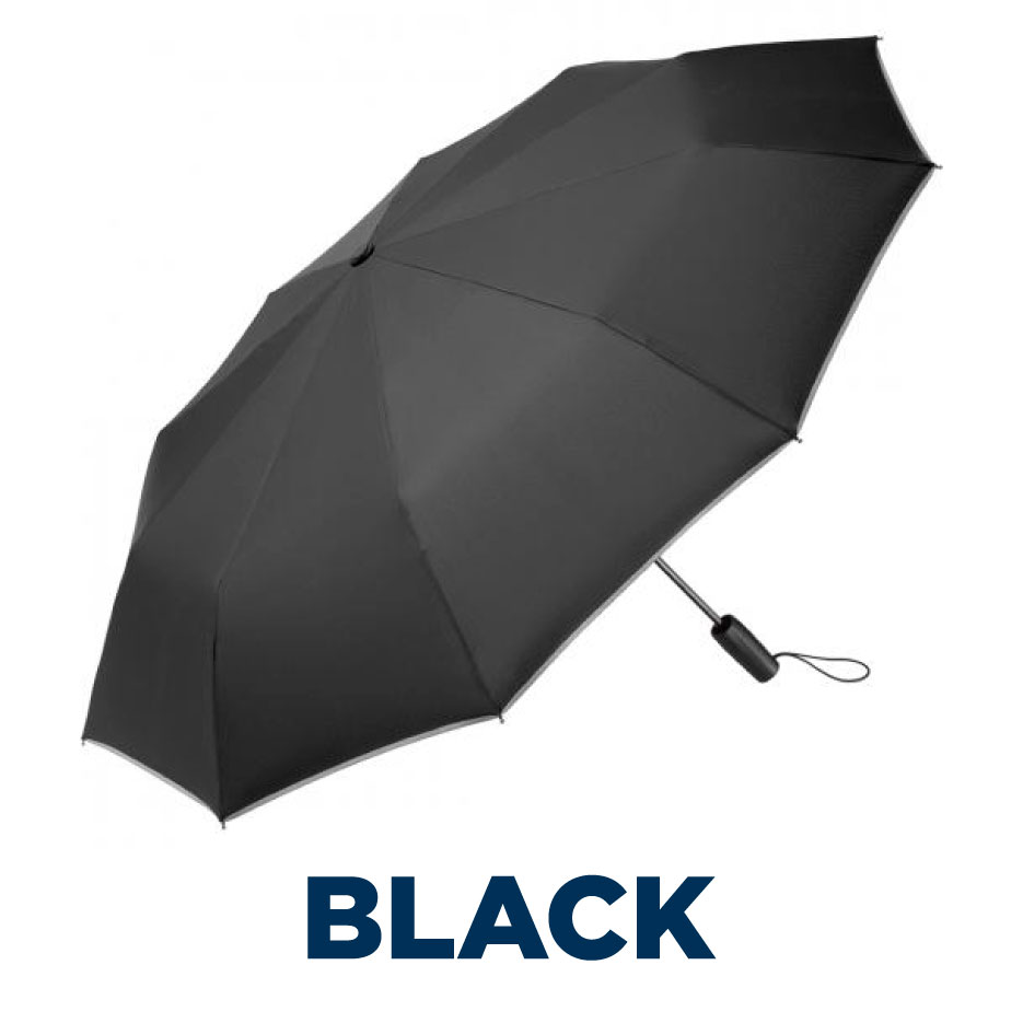Easy to handle thanks to sliding safety runner, high-quality windproof system for maximum frame flexibility in stormy conditions, special umbrella shape through 10 panels, cover with trendy reflective piping in silver, comfortable Soft-Feel handle with elastic loop and promotional labelling option, generous diameter, sleeve with trendy reflective piping.