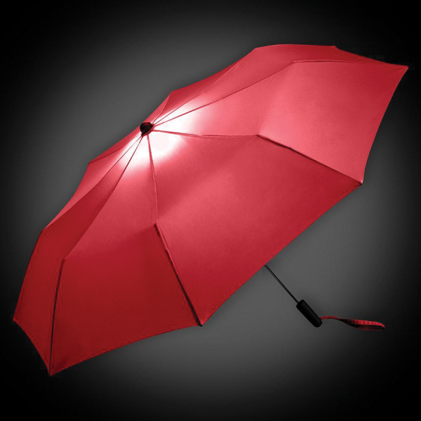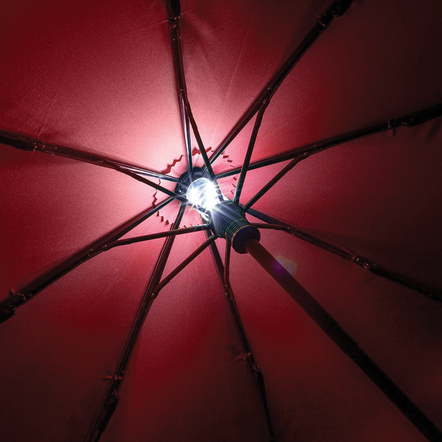 Striking pocket umbrella with interior LED lighting and hanger function