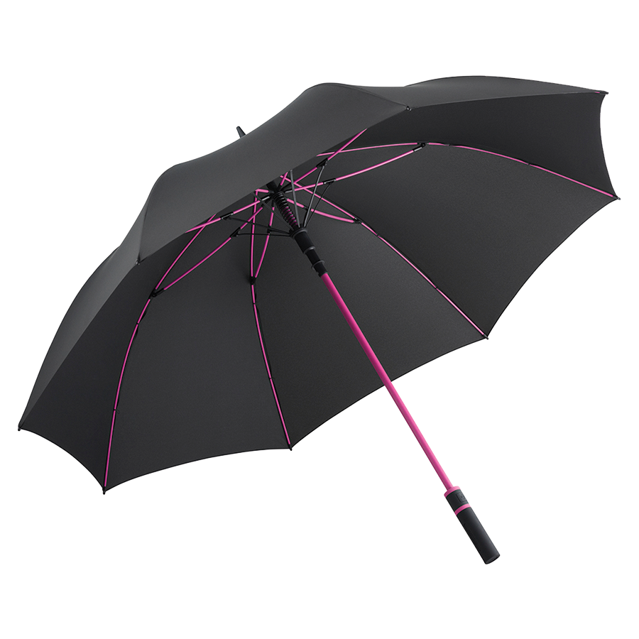 Convenient automatic function for quick opening, high-quality windproof system for maximum frame flexibility in stormy conditions, flexible fibreglass ribs, STANDARD 100 by OEKO-TEX® certified polyester ponge cover material made of recycled plastics, eco-friendly thanks to original waterSAVE cover material, exclusive straight Soft-Touch handle with coloured handle rings and double promotional labelling option. Also available as mini (art. 5084, 5484, 5584) or midsize (art. 4784) umbrella